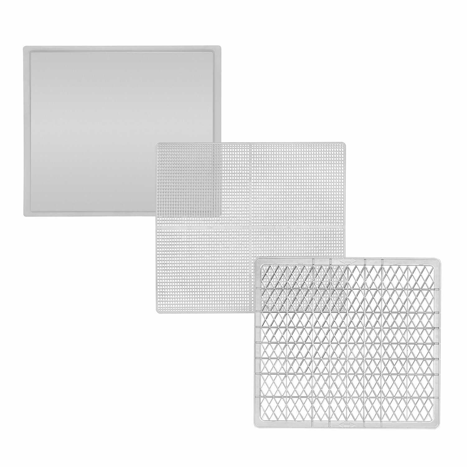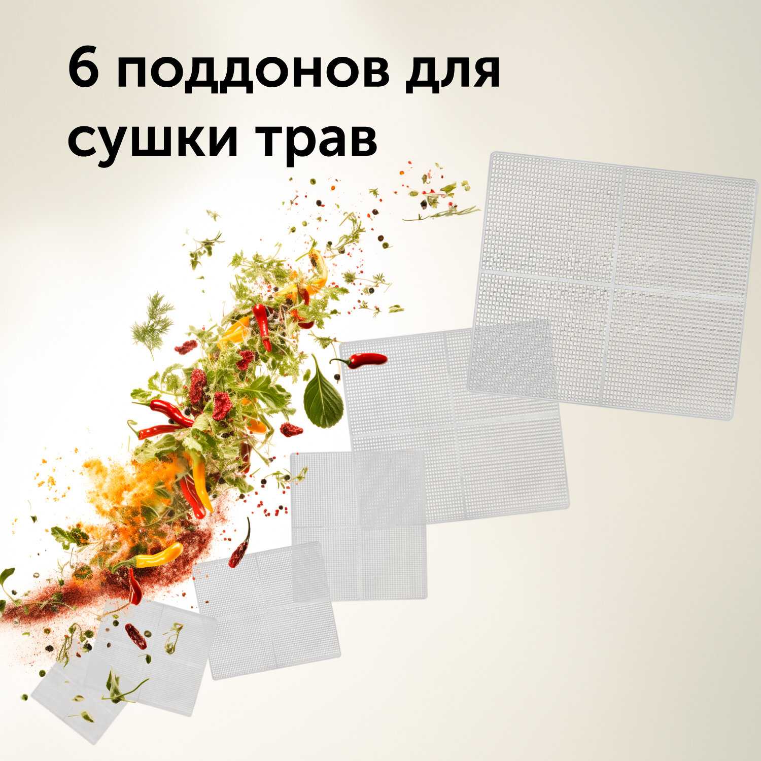 - Комплектация включает 18 специализированных поддонов: 6 сетчатых для фруктов/овощей, 6 для пастилы, 6 для трав/ягод.