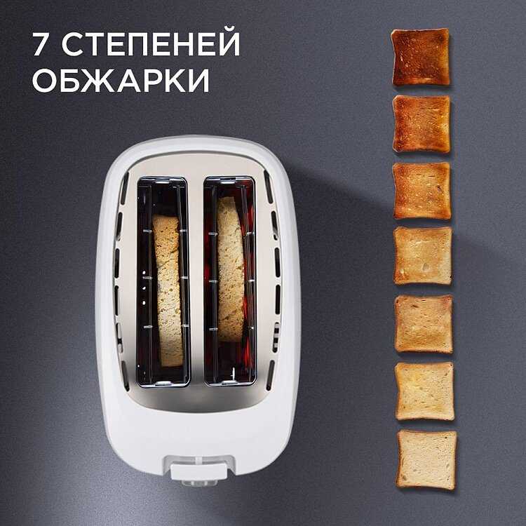 Тостер имеет 6 уровней обжаривания, от слабой до сильной прожарки. Для белого хлеба рекомендуют 2–3 уровень, для ржаного или цельнозернового — 4–5, чтобы получить хрустящую корочку без подгорания. Пользователи отмечают, что хлеб выглядит как на картинке в инструкции при правильном выборе. Регулировка простая и интуитивная, результат соответствует ожиданиям с первого раза. Предпочтения индивидуальны, поэтому стоит поэкспериментировать. -