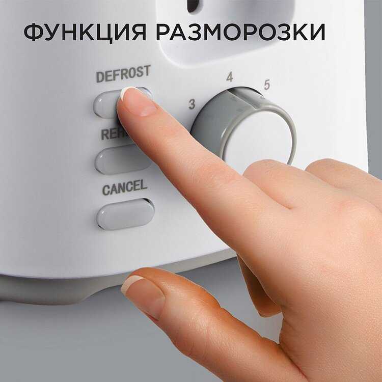 - Режим разморозки и подогрева работает эффективно для замороженного хлеба или остывших тостов.