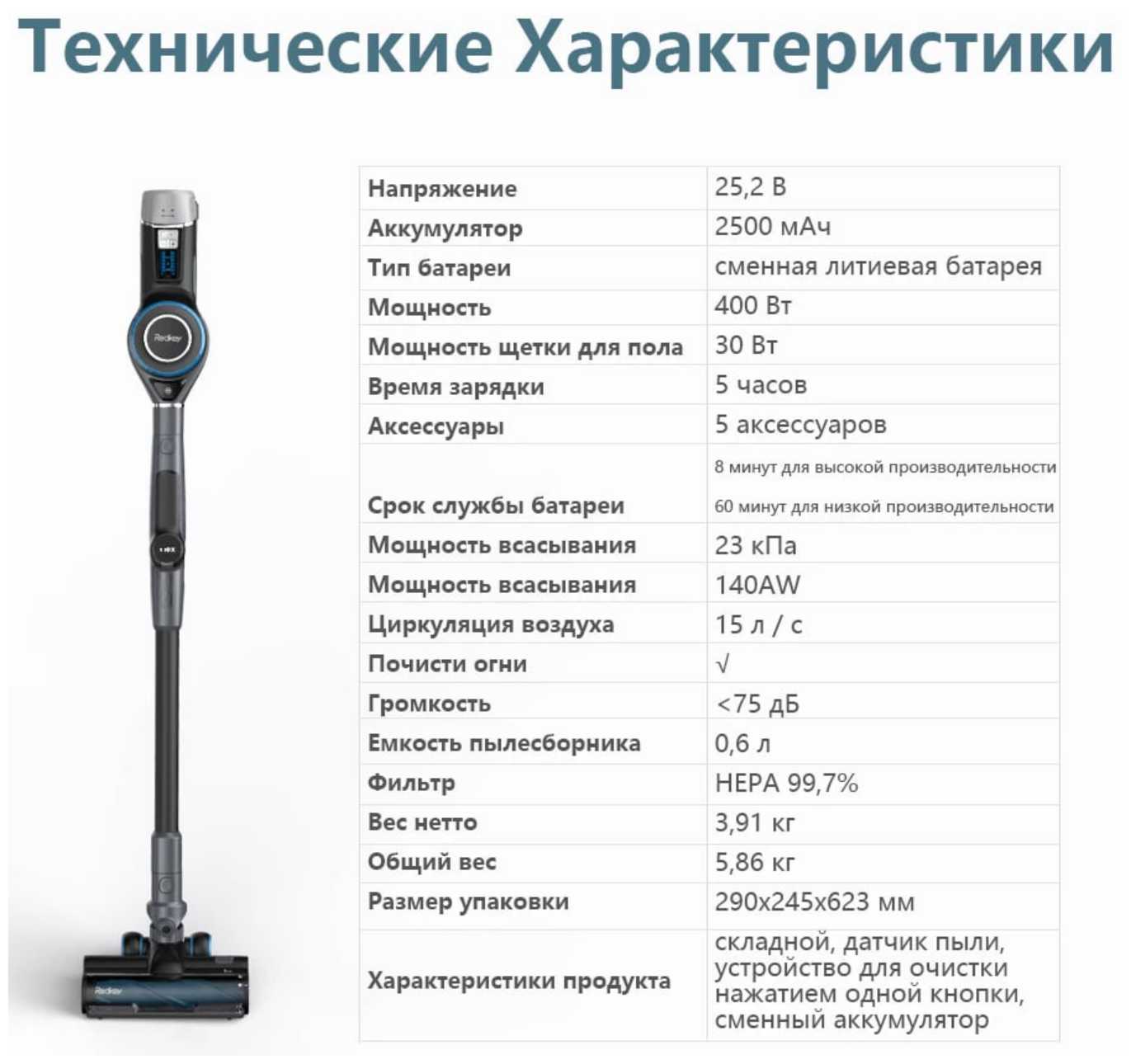 - Зарядки хватает на 20–40 минут в зависимости от режима: на минимуме — до уборки 45–65 м², на максимуме — 10–15 минут для глубокой чистки ковров.