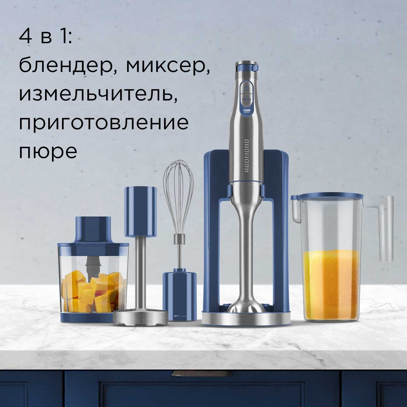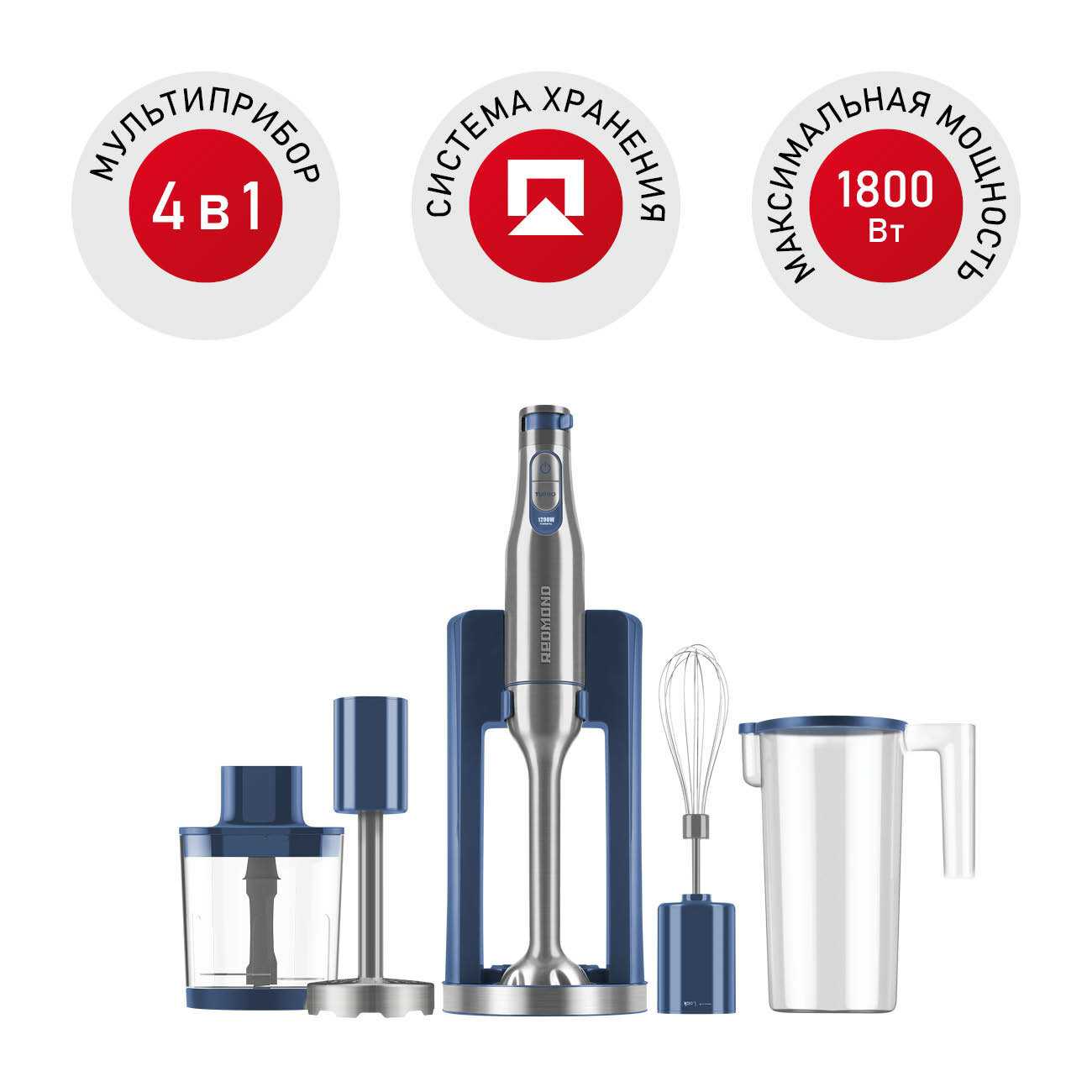 - Все насадки и блендер фиксируются в одном месте, предотвращая потерю деталей и экономя пространство на кухне.