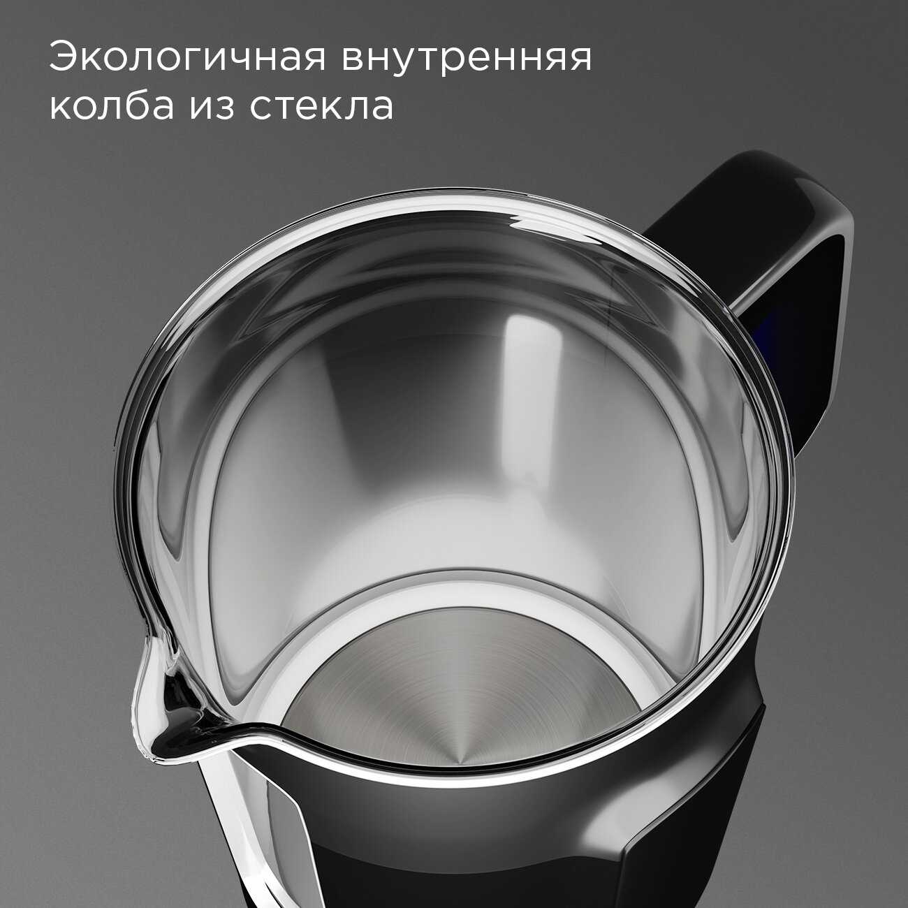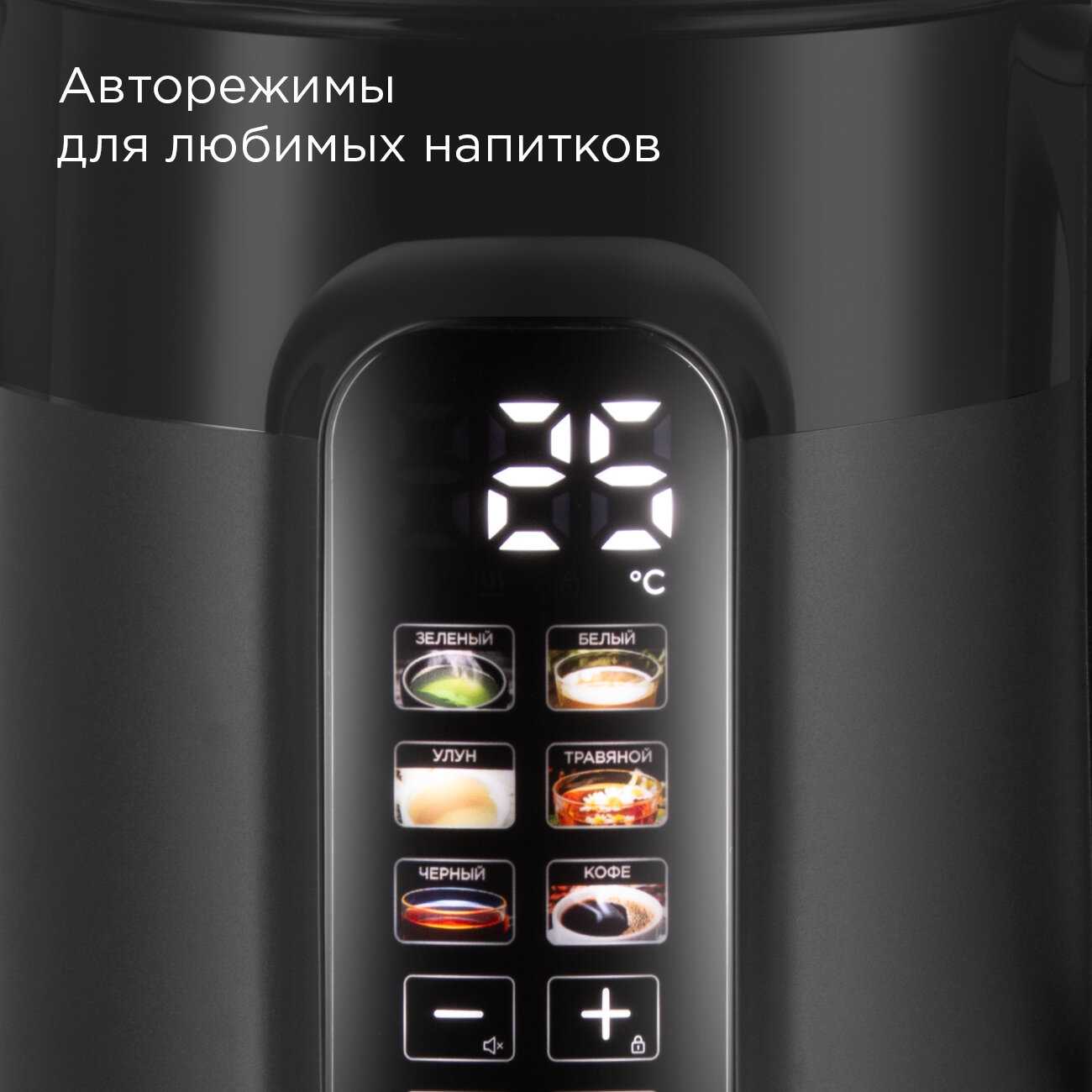 - + Тихий, быстрый. Кипятит воду до 100 градусов, затем опускает до нужной температуры и держит ее. Удобная крышка, и стекло — немного затемнённое, поэтому не видно разводов