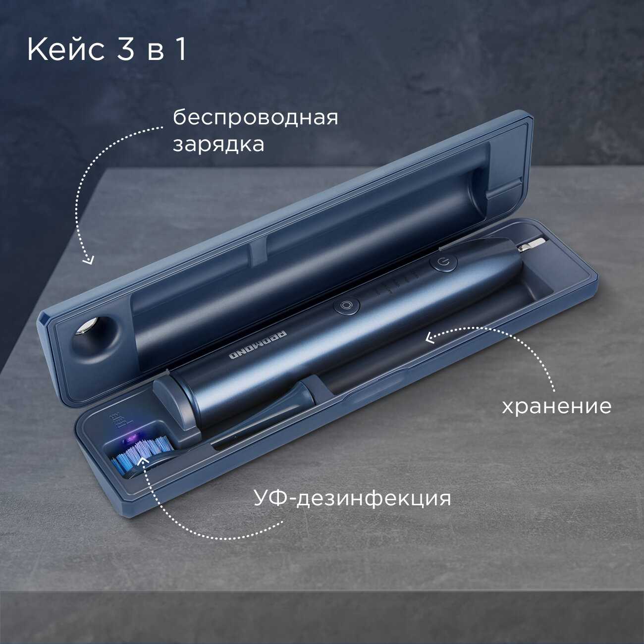- Тройное назначение: хранение, зарядка, стерилизация УФ-лампой, уничтожающей 99% бактерий на насадках.