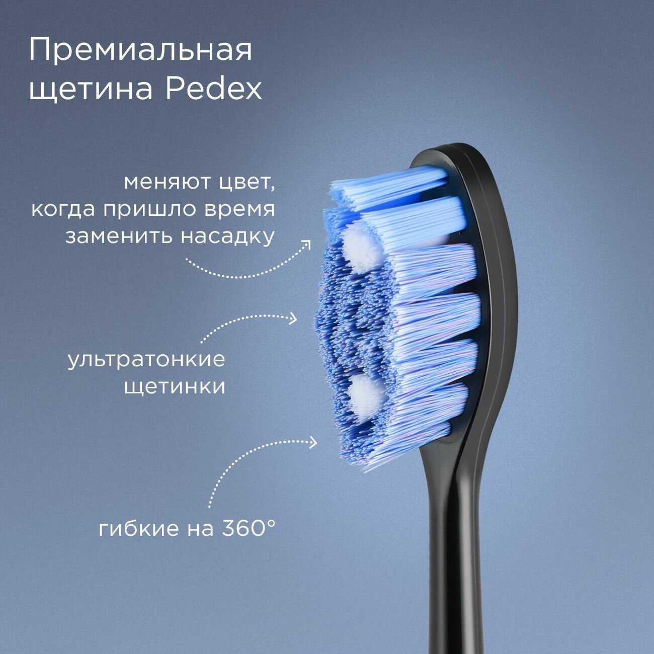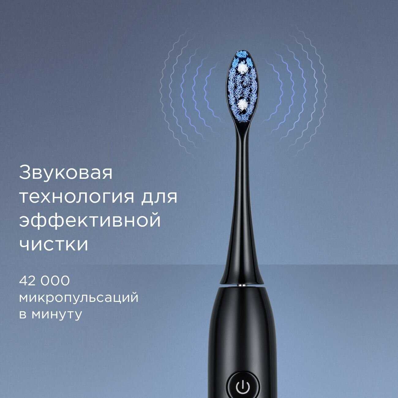 - Звуковая технология с ультратонкими щетинками обеспечивает глубокое удаление налёта из межзубных промежутков и при скученности зубов.