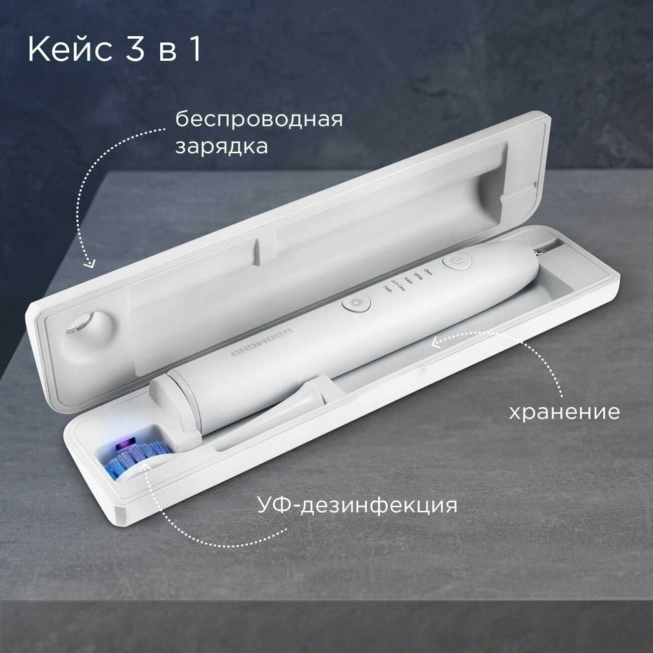 Кейс выполняет три функции: хранение, беспроводная зарядка и УФ-дезинфекция насадок, что высоко оценено пользователями. УФ-лампа уничтожает бактерии, продлевая гигиеничность насадок, а компактный размер позволяет брать щетку в дорогу. Зарядка через кейс происходит автоматически при хранении, исключая разрядку "в пути". Водонепроницаемость корпуса обеспечивает дополнительную защиту при транспортировке. -