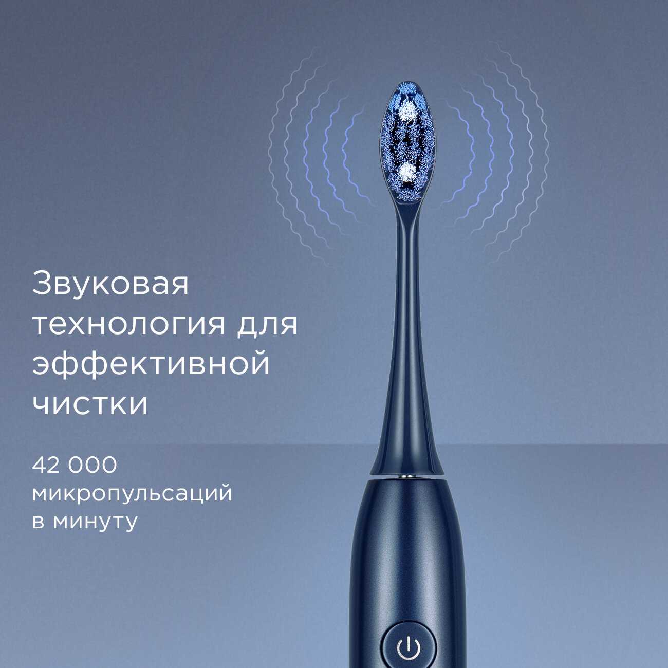 - Звуковая технология с ультратонкими щетинками обеспечивает глубокое удаление налёта из межзубных промежутков и при скученности зубов.