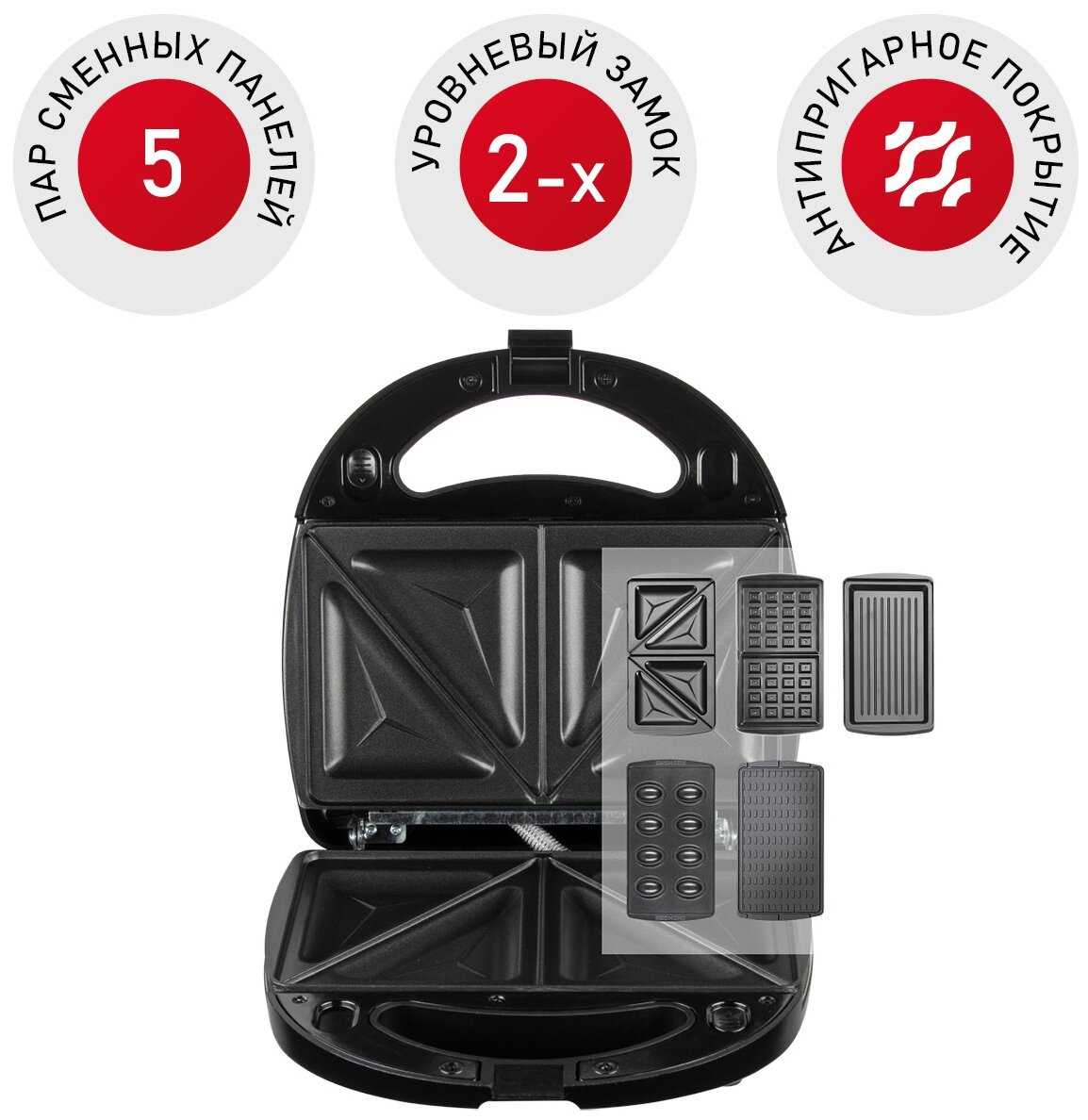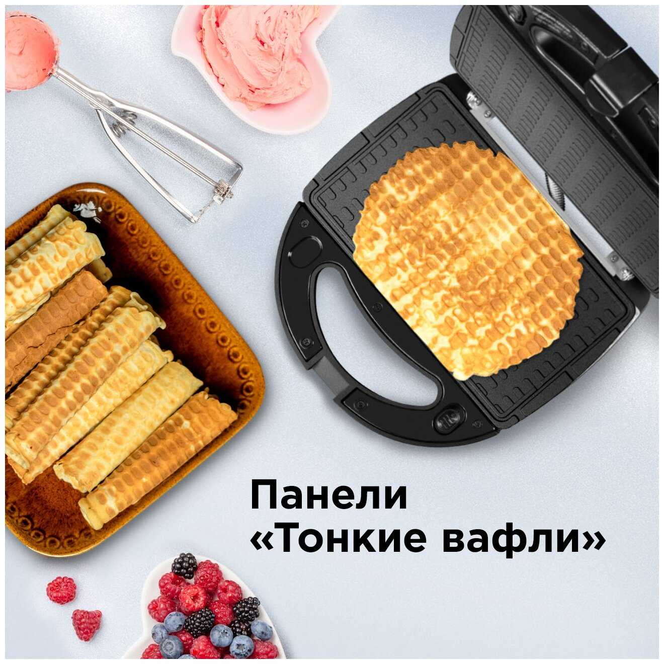 - Наличие панелей для венских вафель, гриля и треугольных сэндвичей позволяет готовить разнообразные блюда без необходимости покупки отдельных приборов.