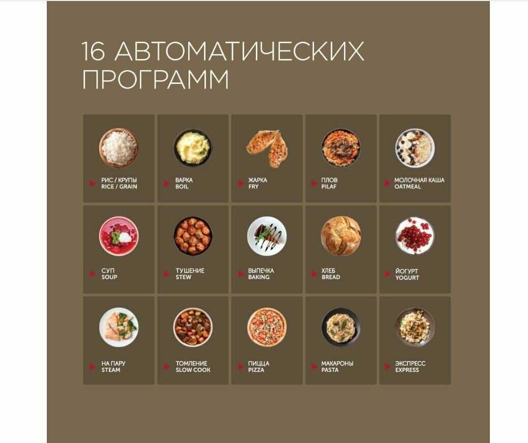 Программы : | варка, выпечка, жарка, запекание, йогурт, крупа, молочная каша, мультиповар, мясо, овощи, пицца, плов, приготовление на пару, суп, тушение, фондю |