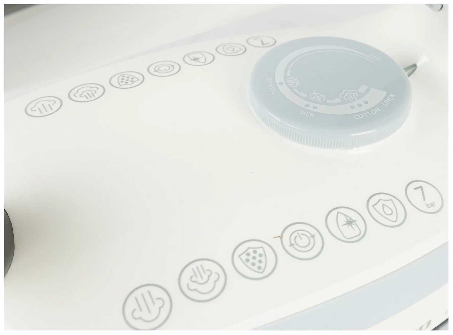 На утюге есть только кнопка подачи пара/парового удара (двойное нажатие). Кнопки на базе (вкл/выкл, режимы) мелкие и требуют ощутимого нажатия, что не всегда комфортно. Панель интуитивна, но качество материалов оценивается как простое — аналогично бюджетным моделям. -