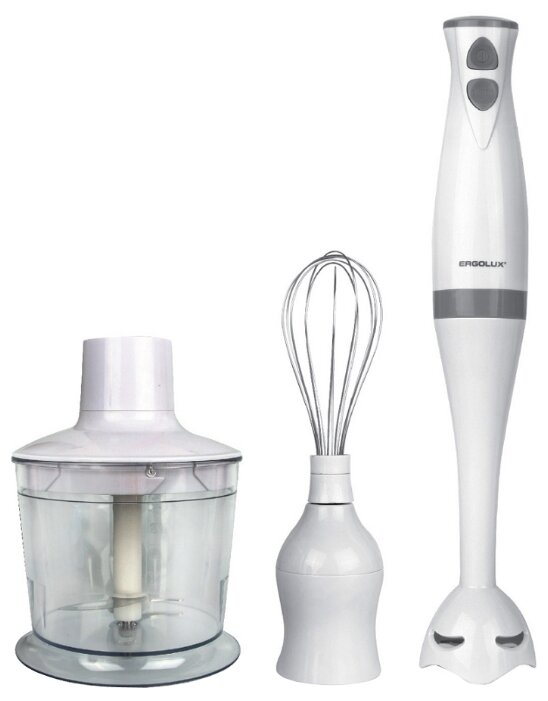 - Включает погружную насадку, венчик, измельчитель с 4 ножами, насадку для пюре и мерный стакан 0.7-1 л.