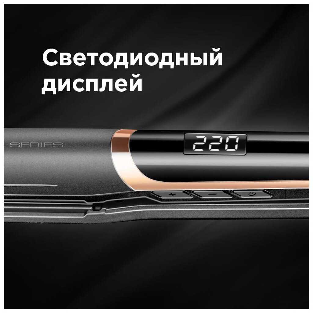 Закругленные края пластин не обжигают кожу лба, а длинный шнур (1.8 м) обеспечивает мобильность. Фиксатор-защелка блокирует утюжок при хранении. Главный недостаток – щель между пластинами (до 3 мм), из-за которой мелкие пряди плохо зажимаются. -
