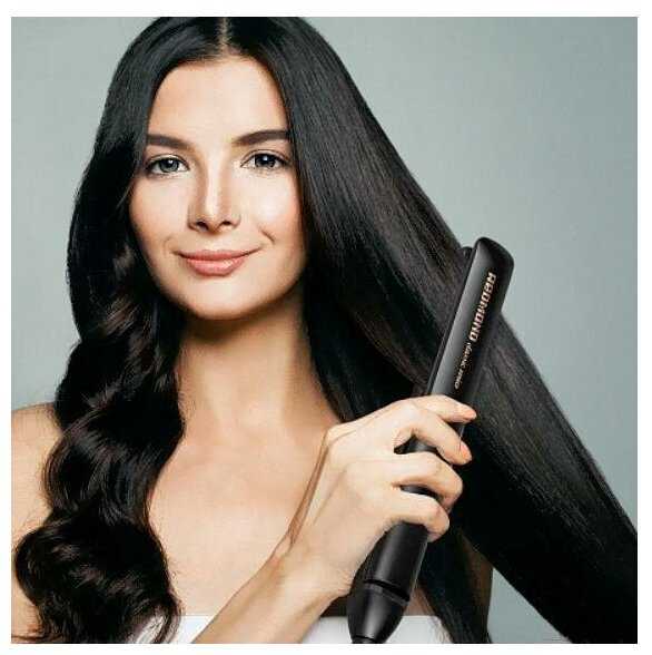 Но главное, что нагревается он до 200 градусов, что позволяет быстро уложить волосы. А керамическое покрытие позволяет делать этот процесс бережным, не повреждая волос.