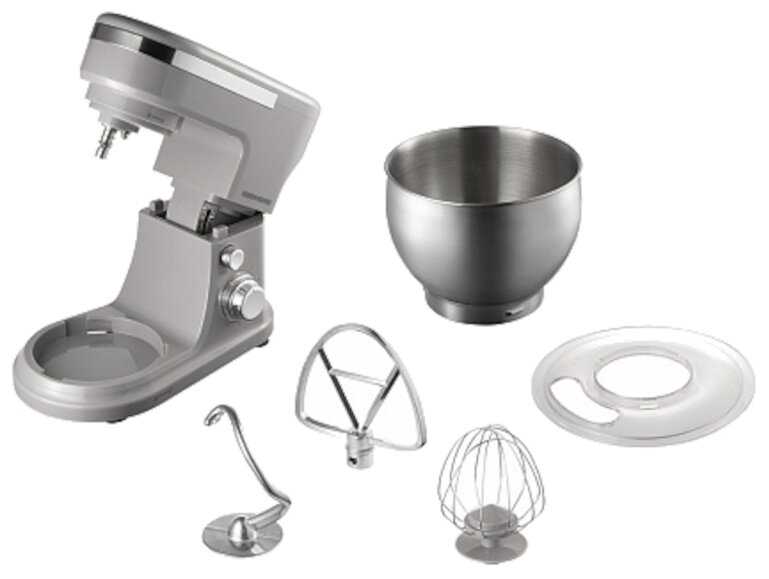 металлические шестерни для долговечности, 6 скоростей, мощность 1100 Вт, 3 комплекта насадок, двойная защита от перегрева и и перегрузки, плавный запуск двигателя, объем стальной чаши 5 литров, плотная крышка на чаше, крышка с отверстием для добавления ингредиентов, планетарный тип смешивания, импульсный режим для однородности, ножки-присоски для устойчивости