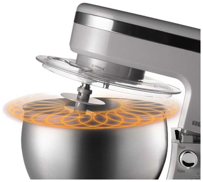 - Насадки вращаются вокруг своей оси и по периметру чаши, что исключает "мертвые зоны" — тесто и кремы получаются без комков.
