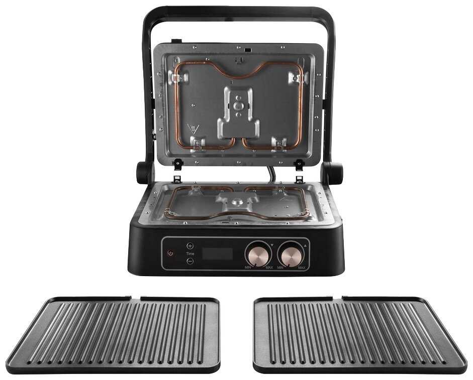 Съёмные панели, удобно мыть. Быстрый нагрев. Жир лишний стекает в лоток, по идее вроде как диетическая еда. Панели греются сверху и снизу. Таймер.