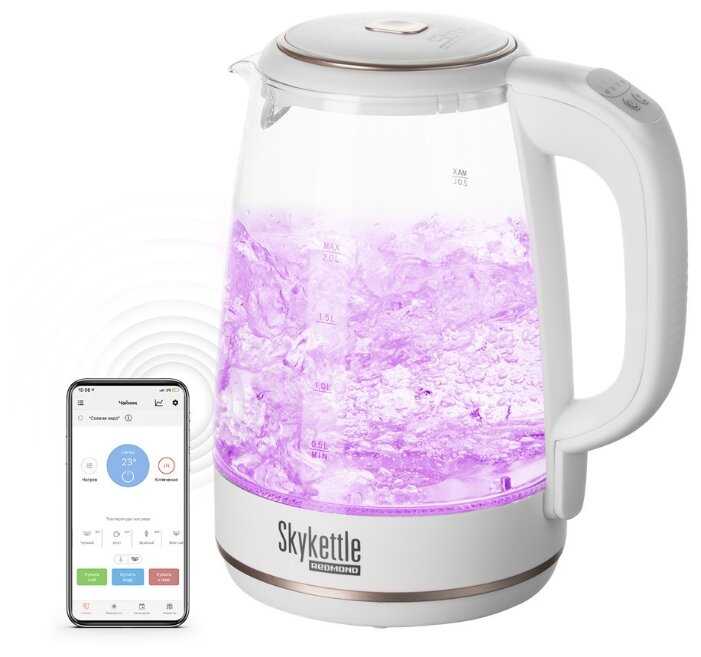 колба из термостойкого стекла, автоотключение при осутствии воды, 5 температурных режимов, настройка кипячения в зависимости от качества воды, крутится на 360 градусов, управляется через смартфон, настраивается цвет подсветки