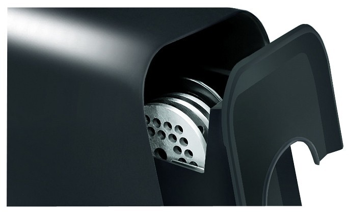 - Встроенный отсек в задней части корпуса вмещает 3 диска, насадку для колбас и кеббе.