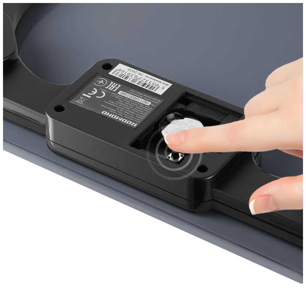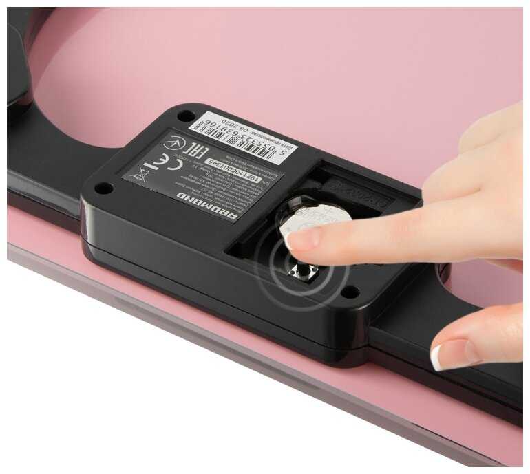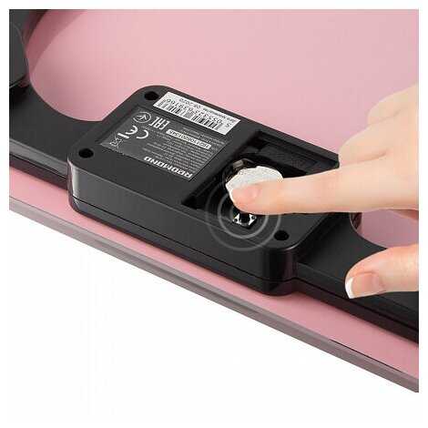 Весы автоматически активируются при контакте с ногами и отключаются через 5-10 секунд после использования без кнопочного управления. Эта функция исключает ручные манипуляции и продлевает срок службы батарейки типа CR2032 до 6-12 месяцев при ежедневном использовании. Индикатор на дисплее предупреждает о разряде заранее. -