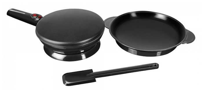 - + Быстро, отдельная подставка, сковорода без шнура,антипригарное покрытие,тонкие блинчики, в наборе книга рецептов