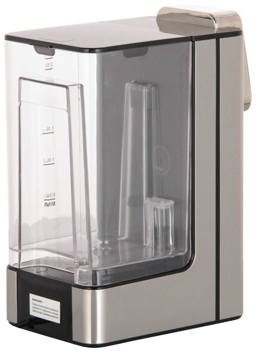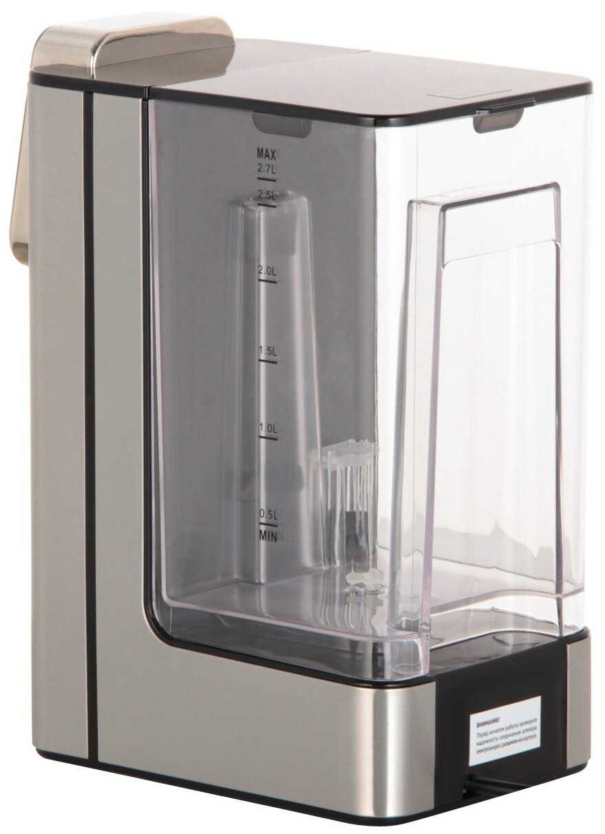 - Прозрачные стенки с мерной шкалой упрощают контроль уровня воды.