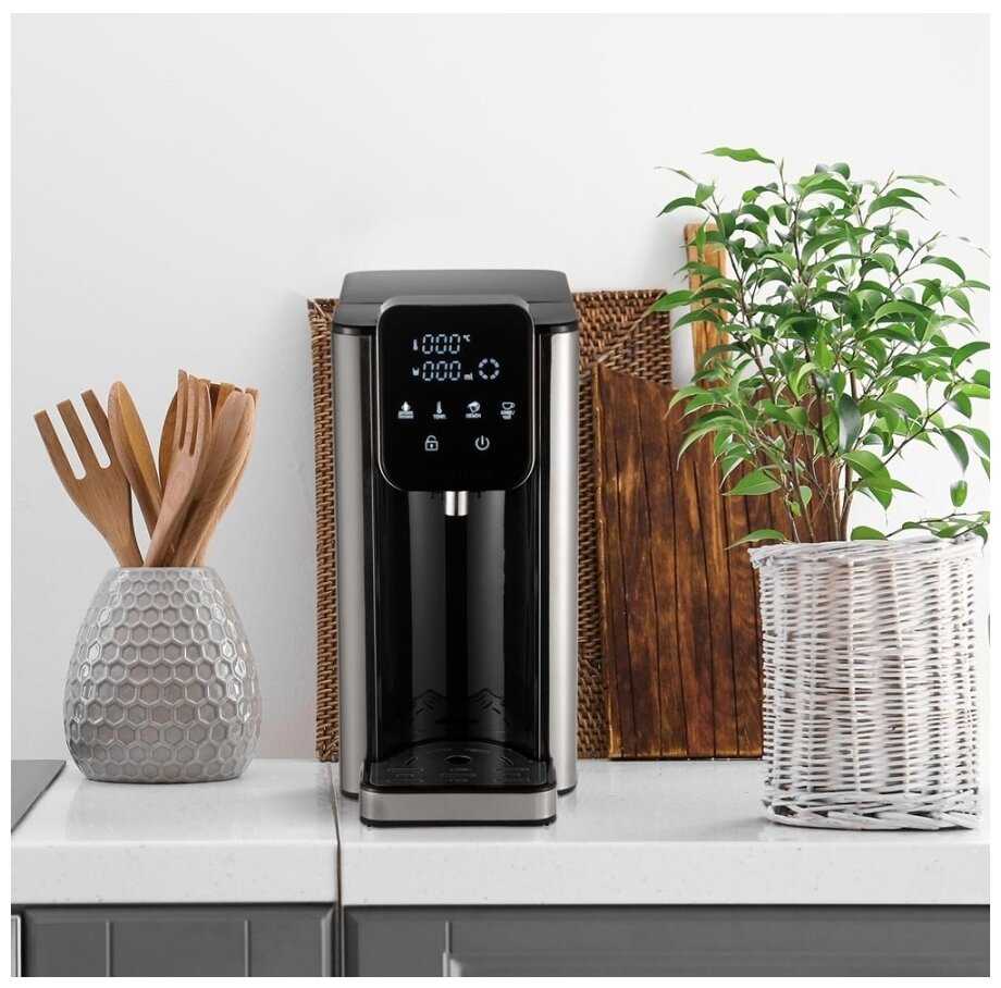 - + поточный нагревательный элемент дает почти моментальный нагрев, 6 температурных режимов от 45 градусов, есть блокировка подачи воды от детей, автоотключение при недостаточном количестве воды, объем резервуара 2.7 литра, мощность 2600 Вт, удобное сенсорное управление, выбор объема порции (200, 300 или 400 мл)