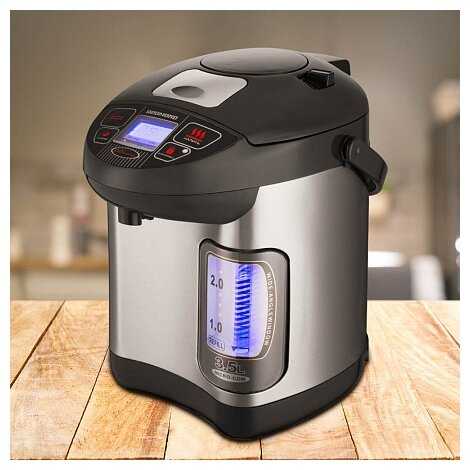 Отличный гибрид чайника и термоса. Купили его случайно, но уже так привыкли, что обычным чайником уже не пользуемся. Воду кипятит быстро, а можно ее и подогреть до 65, 85, 98 градусов. Когда термопот наберет нужную температуру, он сам отключается. Есть и очень полезная функция блокировки включения, это актуально тем людям, у которых есть дети. Сделан из нержавеющей стали, с управлением через ЖК-дисплей. Выглядит это все сочетание очень стильно.