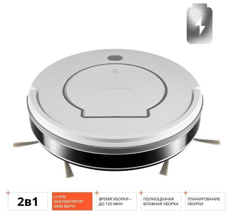 - Заряда хватает на 2 часа работы — этого достаточно для уборки 80–100 м².