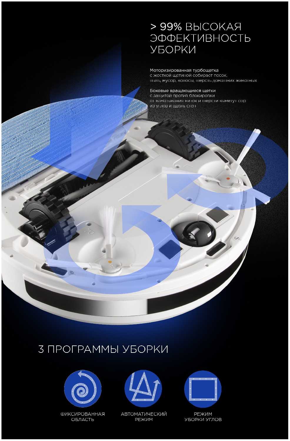 - Настройка расписания, выбор режимов (автомат, локальная уборка, зональная чистка) доступны дистанционно.