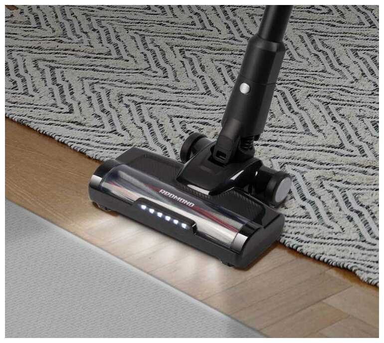 - Подсветка на турбощётке визуализирует мелкий мусор, что особенно ценится при уборке в тёмных углах.