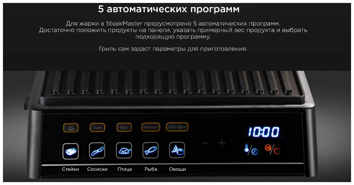 - Встроенные программы автоматически подбирают время и температуру в зависимости от типа продукта и его массы (например, для стейка весом 250 г).