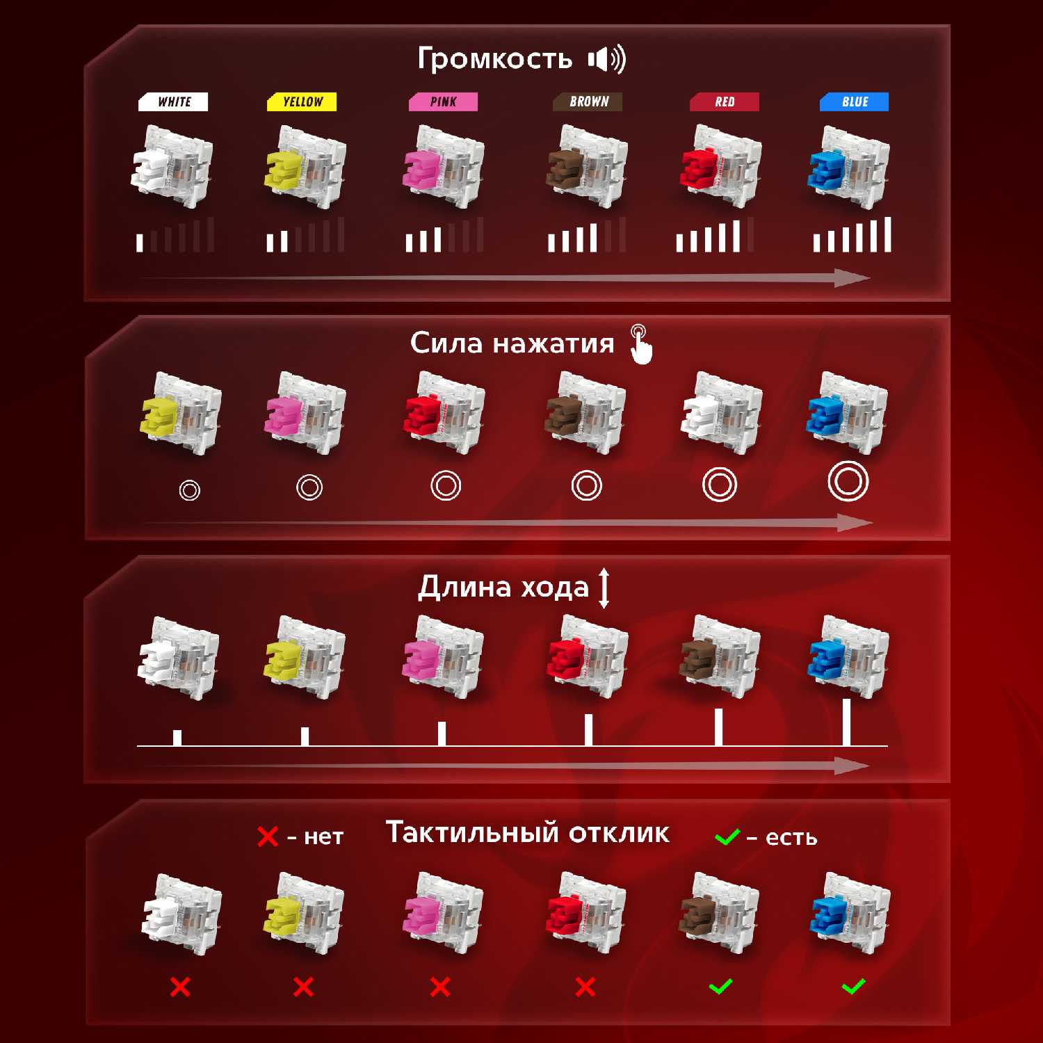 - Многие наслаждаются "хрустящим" или "приятным клацаньем", тише мембранок, подходит для игр и печати.