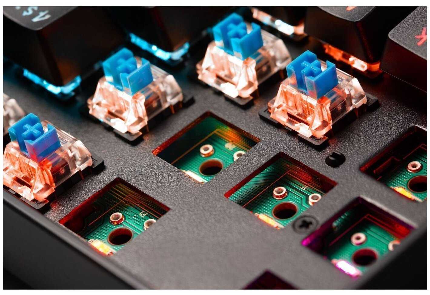Синие/зеленые свитчи издают громкий клик (до 45 дБ), мешающий в ночное время. Enter, Backspace и Shift звучат громче пробела из-за особенностей стабилизаторов. Для офиса оптимальны коричневые или модифицированные смазкой переключатели. -