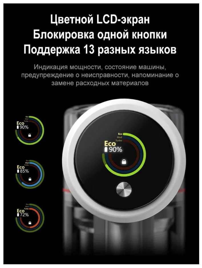 - Дисплей отображает режимы работы, уровень заряда и ошибки (например, E13 — засор).