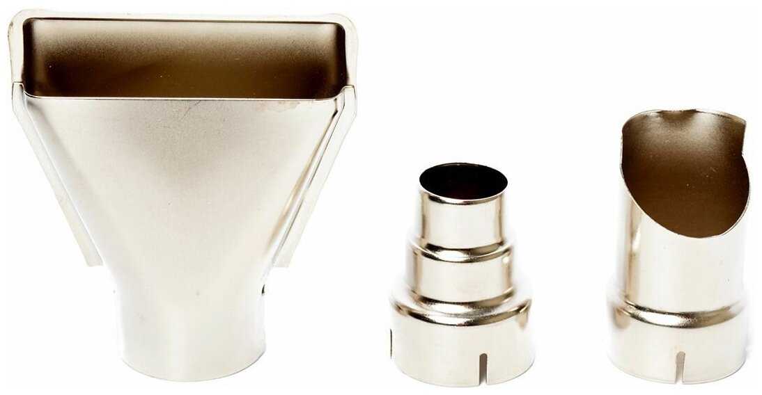 Фен комплектуется тремя насадками, включая плоскую с козырьком вместо классической плоской, что затрудняет некоторые работы. Пользователи успешно применяли их для термоусадки шумоизоляции на ванне, укладки напольных покрытий и монтажа автомобильного обвеса. Отмечается отсутствие сужающейся насадки, заявленной в инструкции. -