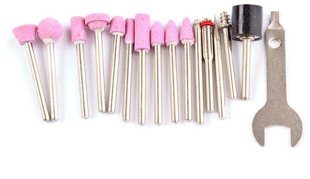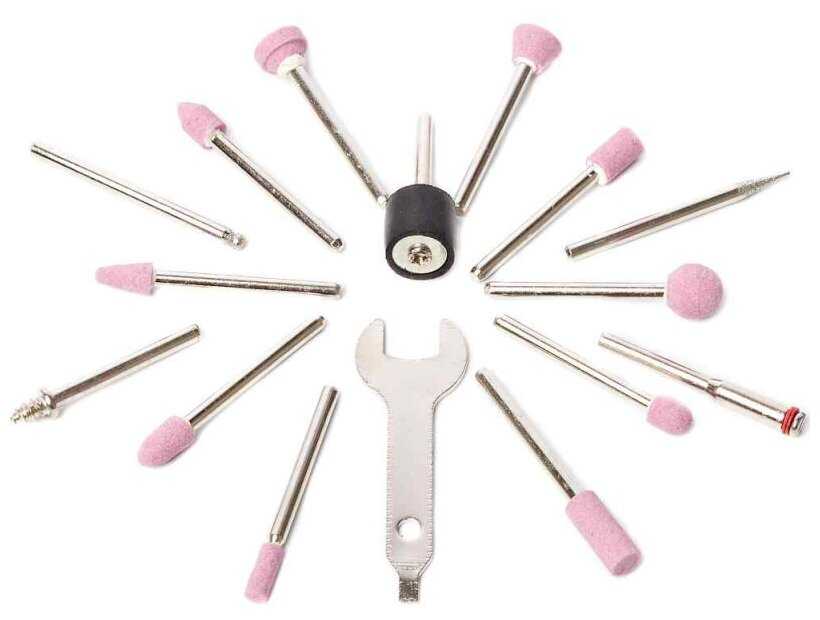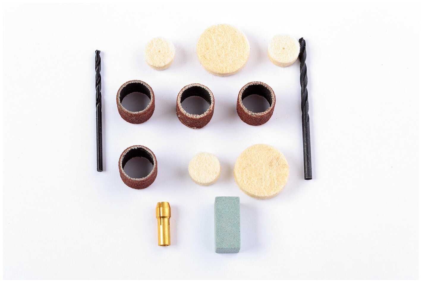 | Комплектация : | машина прямая шлифовальная, отрезные круги - 36 шт., шлифовальная бумага - 36 шт., абразивные шлифовальные головки с хвостовиком ø3.2мм - 10 шт., держатель шлифовальных лент с хвостовиком ø3.2мм - 1 шт., шлифовальная лента-4шт., сверла - 2шт: ø2.3/3.2 мм, гравировальный резец - 2шт с хвостовиком ø3.2мм., держатели отрезных и полировальных кругов с хвостовиком ø3.2мм - 2шт., войлочный полировальный круг - 4шт., точильный брусок - 1 шт., Цанга - 2 шт: ø2.3/3.2 мм, гаечный ключ - 1 шт. |