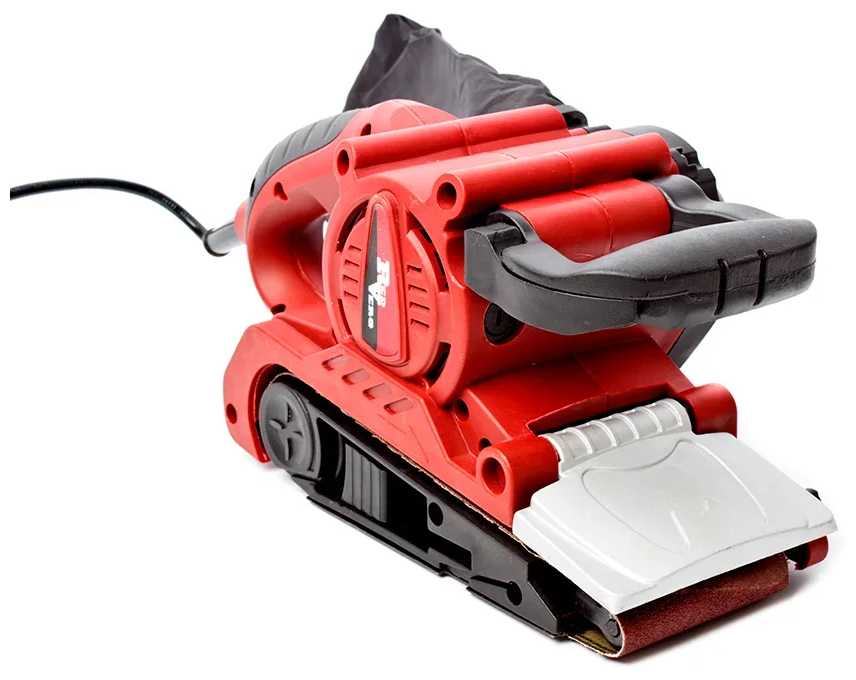 Хороший аппарат с мощностью чуть выше среднего (850Вт.) при среднем весе (3,1кг., руки не устают). Имеет малый ведомый ролик и поднимающийся кожух шлифовальной ленты. Регулируемая передняя рукоятка это очень удобно при выполнении различных операций. Добротный ударопрочный пластик корпуса. Быстрый доступ для замены щёток. Порадовал чёткой работой фиксатор кнопки пуска. Есть регулировка скорости вращения ленты, что тоже плюс. Регулировка сдвига ленты ручная, что тоже считаю плюсом при стационарном использовании. Лента при работе не съезжает, нормально держит центр. Механизм замены ленты работает нормально.