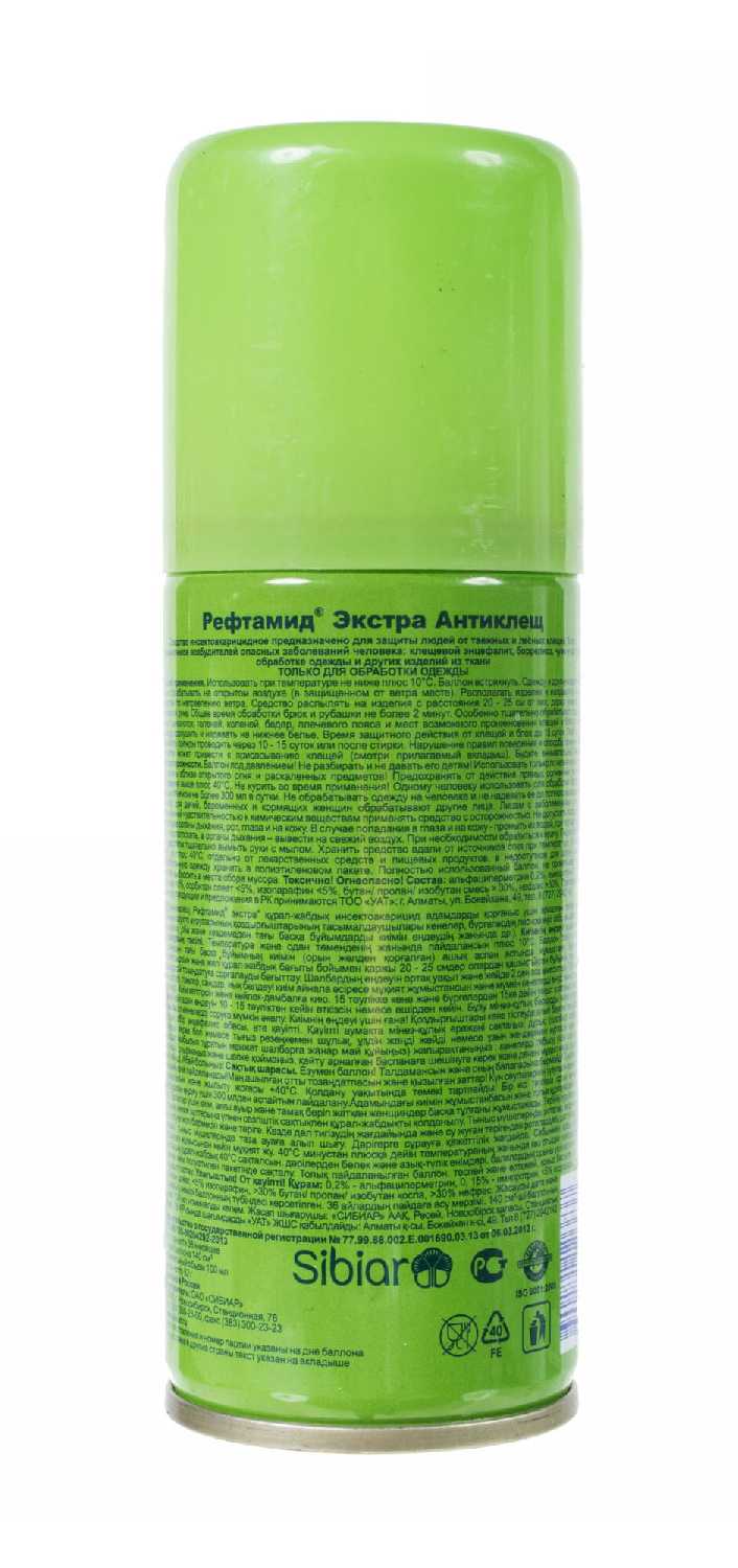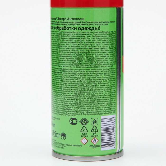 | Способ применения : | Перед применением баллон встряхнуть. Одежду и другие изделия из ткани обрабатывать на открытом воздухе (в защищенном от ветра месте). Средство распылять на изделия с расстояния 20 - 25 см. Общее время обработки брюк и рубашки не более 2 минут. Особенно тщательно обрабатывать одежду вокруг щиколоток, голеней, коленей, бедер, плечевого пояса и мест возможного проникновения клещей и блох к телу. Повторную обработку одежды проводить через 10 - 15 суток или после стирки. |