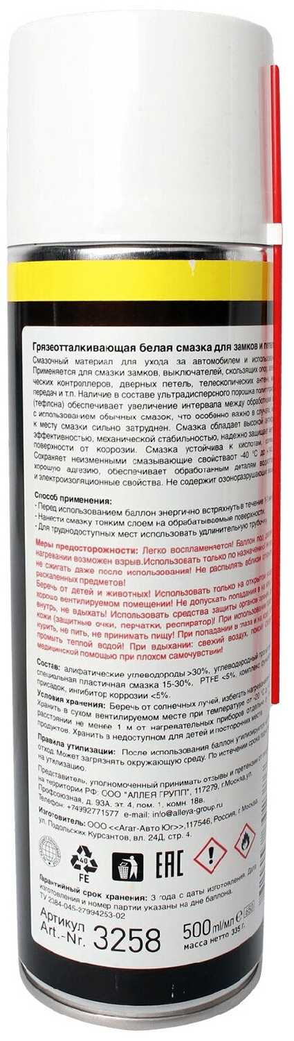 Дополнительная информация : | использование грязеотталкивающей белой смазки для замков и петель с PTFE помогает обеспечить смазку контакта деталей, отталкивающую влагу и грязь, увеличивая срок службы соответствующих узлов |
