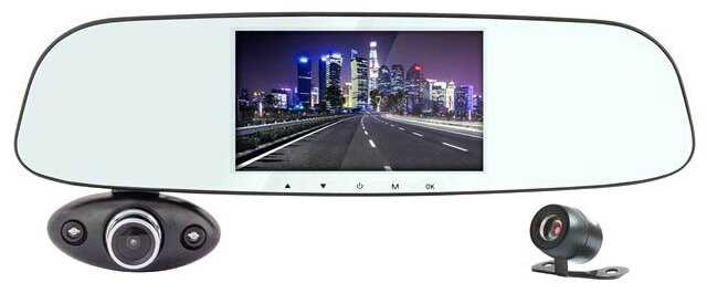 - регистратор в виде зеркала с 3 камерами запись видео 1920×1080 при 30 к/с угол обзора 120° с экраном 5" работа от аккумулятора поддержка карт памяти microSD (microSDHC) встроенный микрофон подключение внешних камер