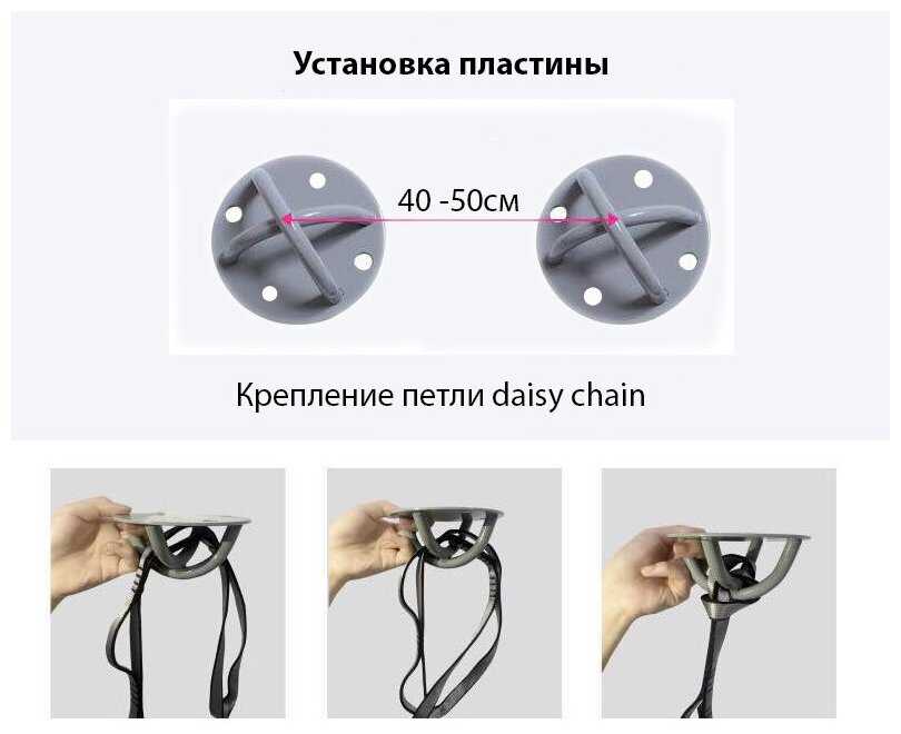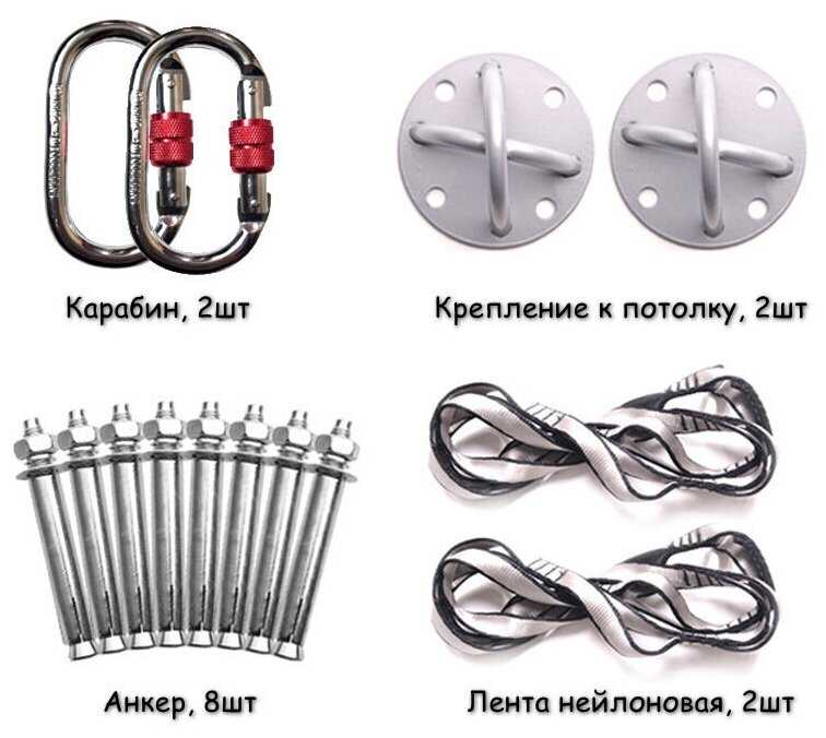 - Включает ткань, стропы (дейзи чейн), карабины, анкеры и веревочные крепления для регулировки высоты.