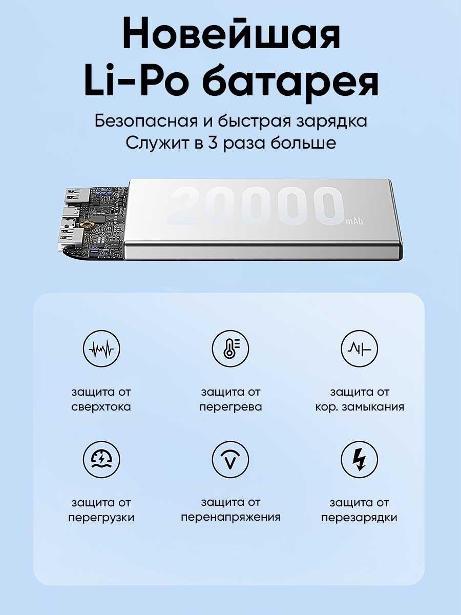 - + Четкий павербанк .ничего лишнего .экран с показателем оставшегося заряда .Петелька для подвешивания . Быстрая зарядка и павербанка и телефона .