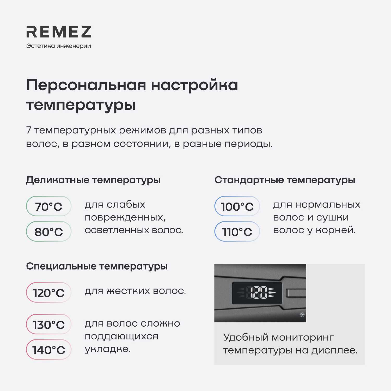 Устройство предлагает несколько температурных настроек (например, 100°C, 120°C), которые можно выбрать в зависимости от типа и толщины волос. Цифровой дисплей отображает текущие параметры, а функция автопамяти сохраняет предыдущие настройки.