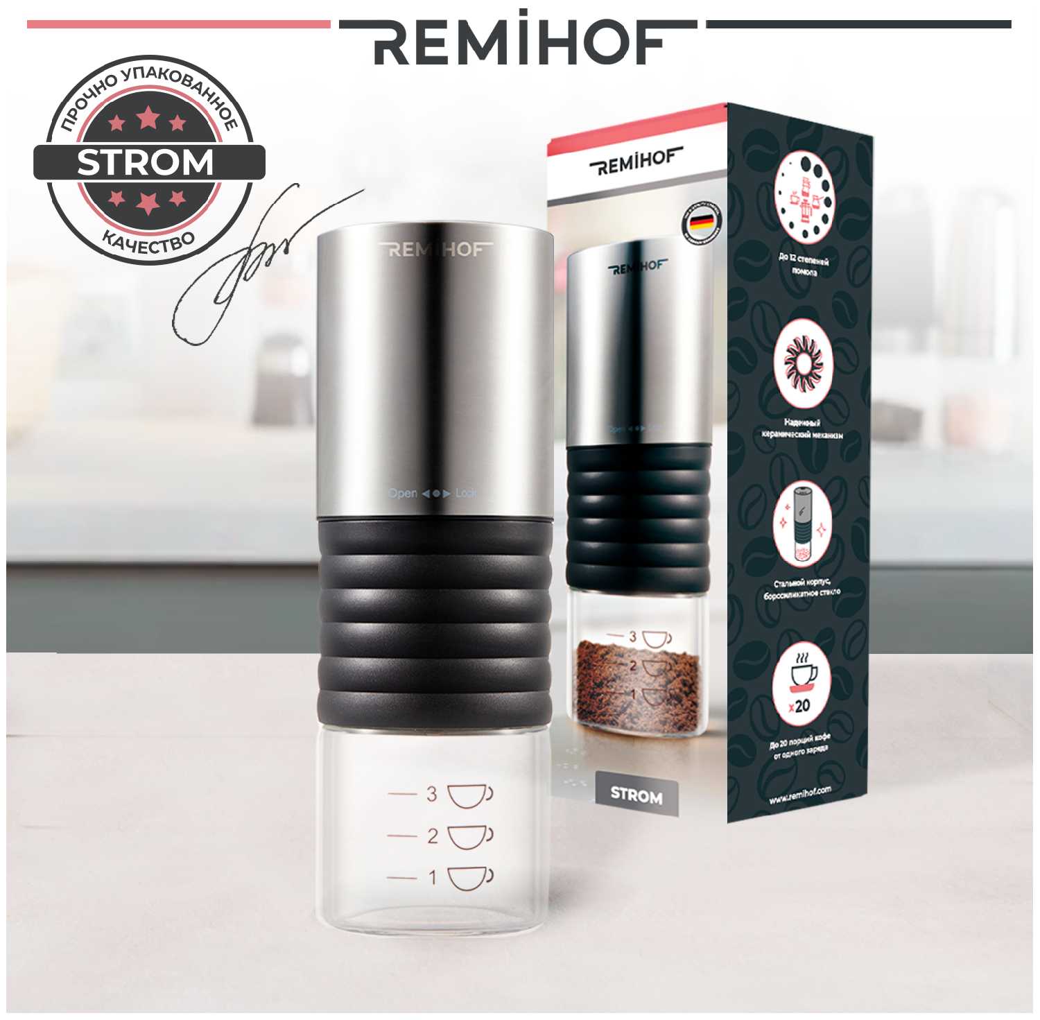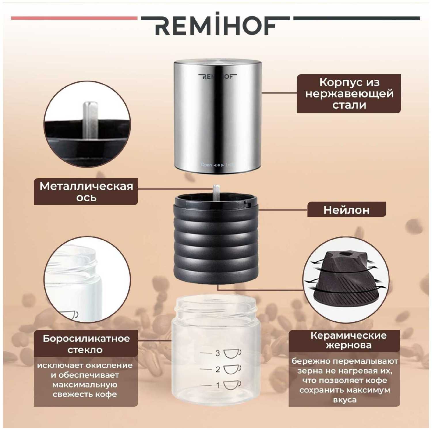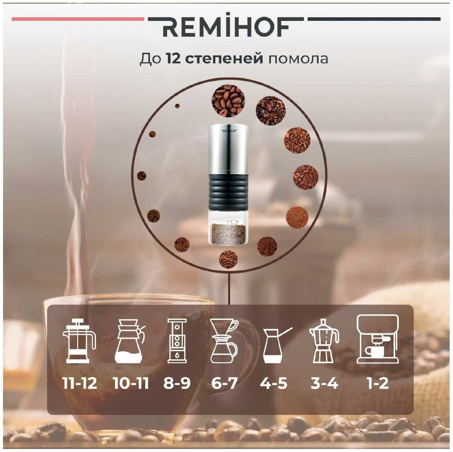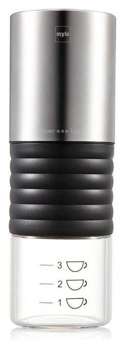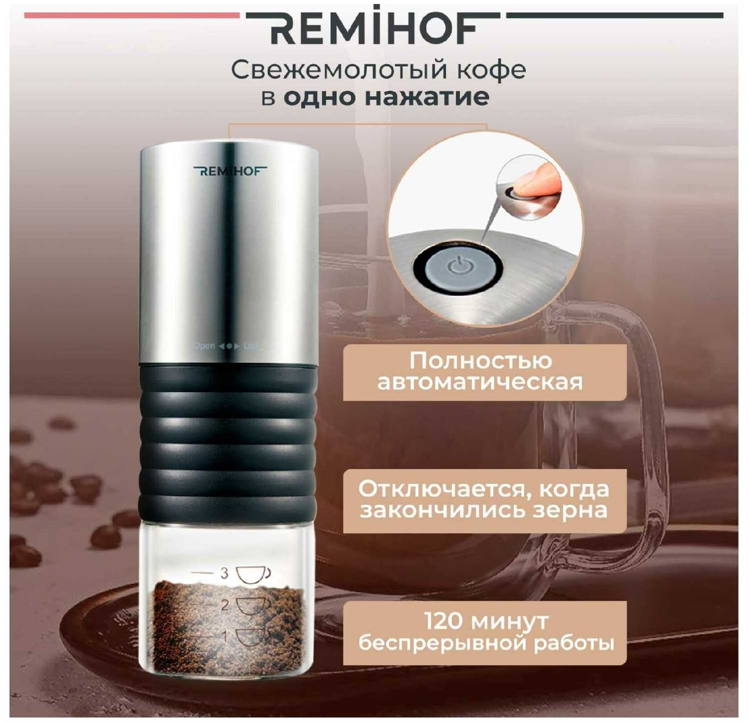 - + Компактная. Простая в использовании. Без провода. По окончании помола отключается сама