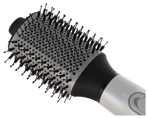 - Овальная форма насадки с комбинированными щетинками (пластиковые + нейлоновые) позволяет одновременно выпрямлять длину и подкручивать концы.