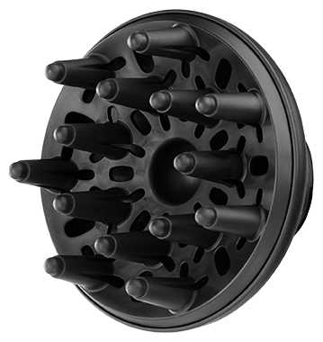 - Диффузор с широкими «пальцами» равномерно распределяет воздух, подходит для кудрявых волос, сокращает время сушки.