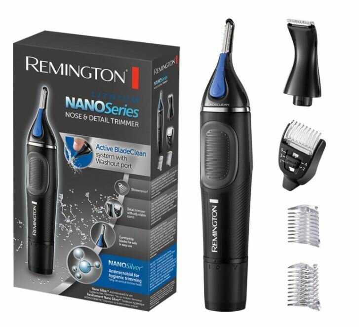 Антибактериальном корпус из наносеребра. Хорошое сбривает волосы в носу и ровняет брови. Есть насадки различной длины и формы. Очищать лезвия легко под струей воды. Прорезиненные вставки на корпусе.