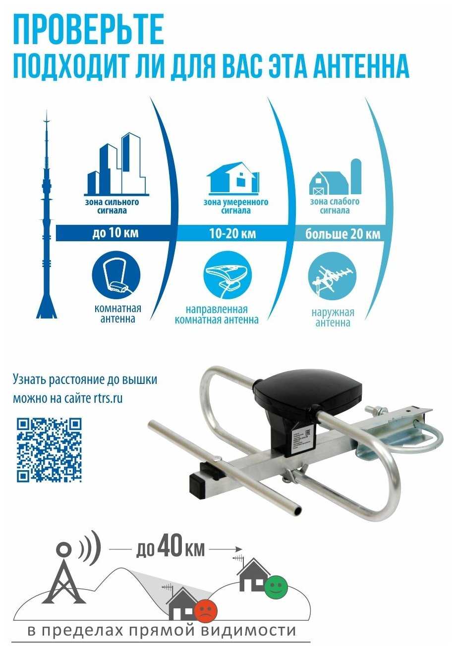 | Дополнительная информация : | уверенный прием телевизионного сигнала в зоне до 40км от телевышки, со схемой расположения вышек в Вашем районе Вы можете ознакомиться на сайте РТРС.ru |