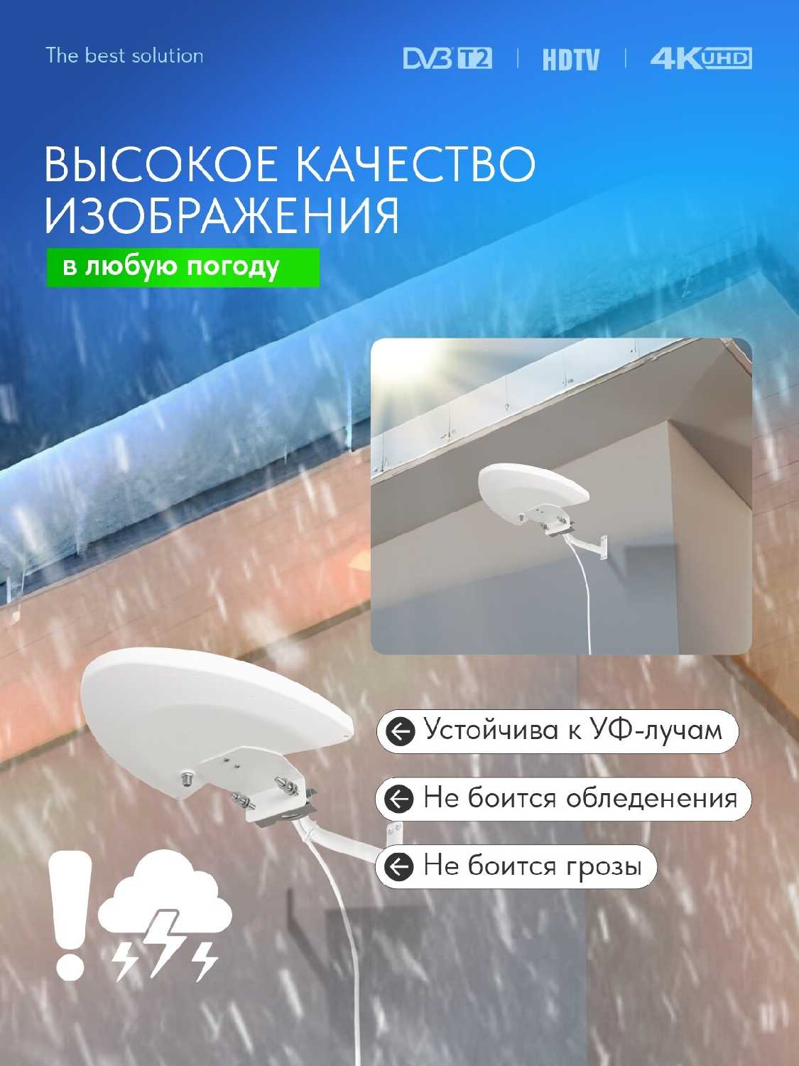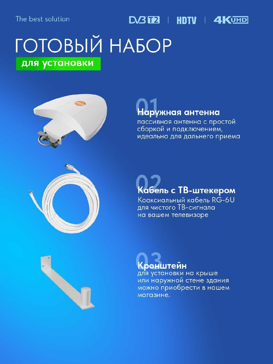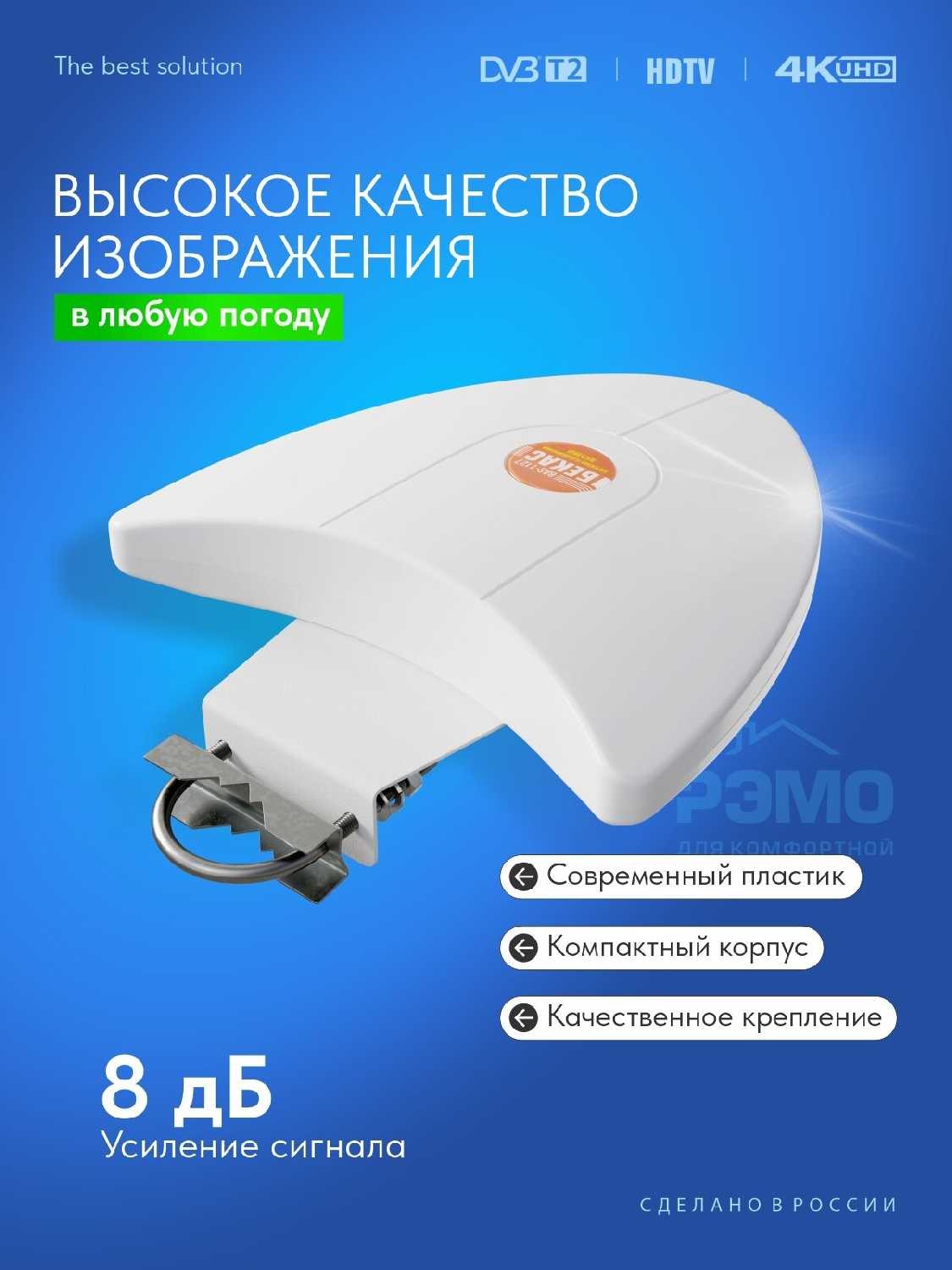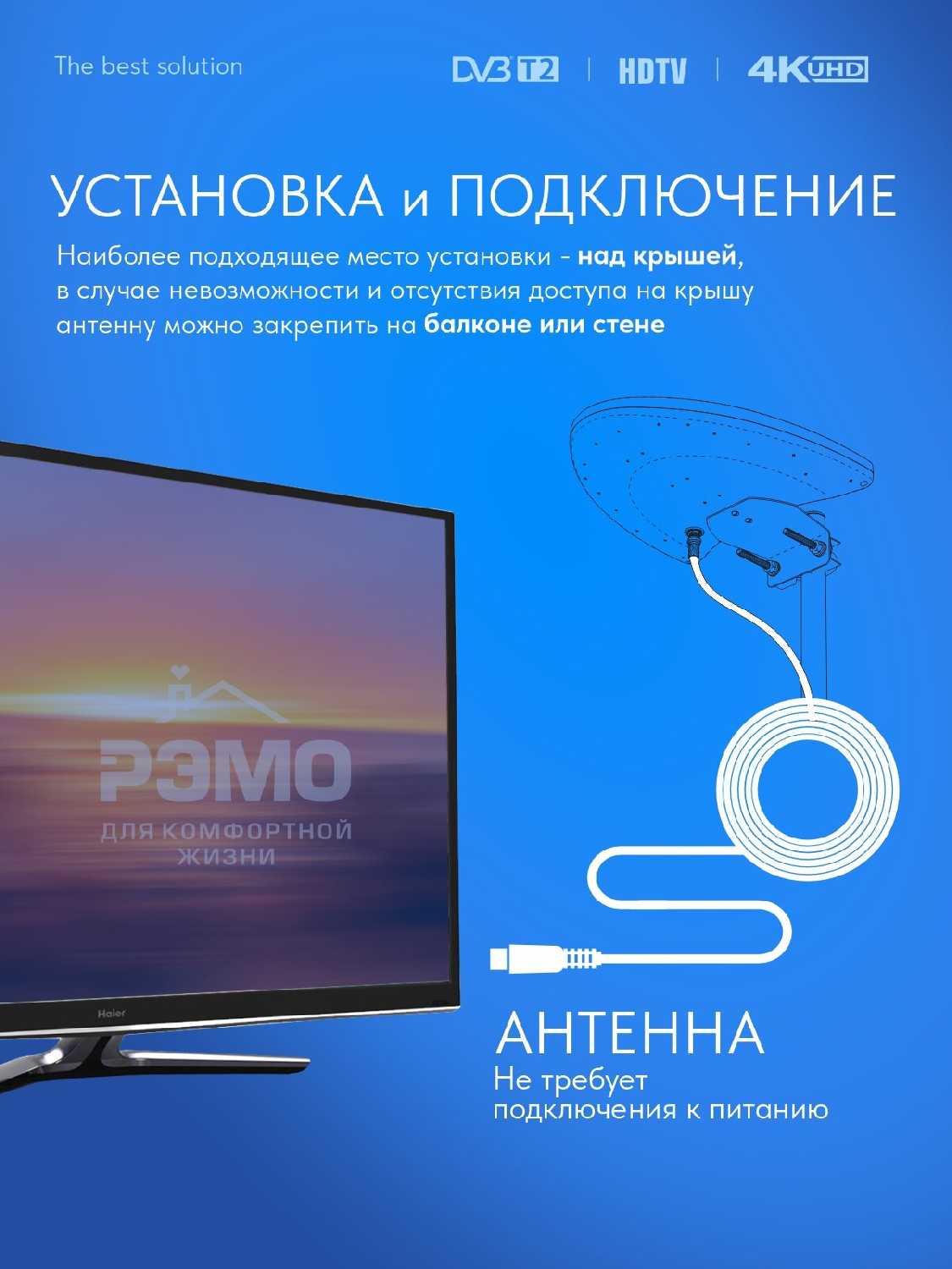 | Дополнительная информация : | уверенный прием телевизионного сигнала в зоне до 40 км от телевышки, с картой расположения телевизионных вышек в Вашем районе можно ознакомиться на сайте РТРС.ru |