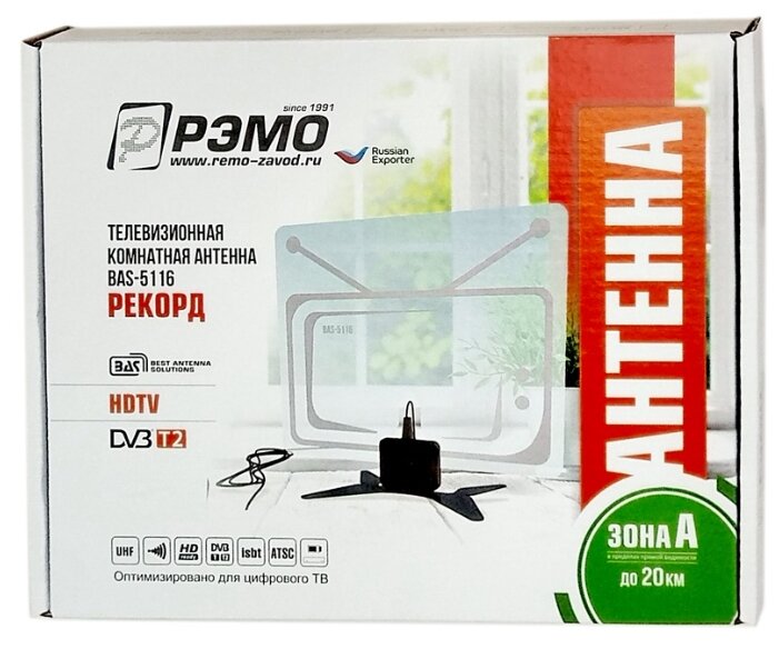 Ловит отлично. Поставила антенну за телевизор и забыла о ней. Необычный дизайн. Можно прилепить на стену или окно и антенна не будет бросаться в глаза или закрывать свет (в комплекте двусторонний скотч), можно поставить на стол (есть металлическая подставка). Питание как от usb, так и от розетки (в комплекте есть блок питания). На коробке значок Russian exporter.