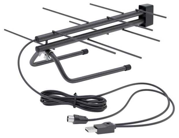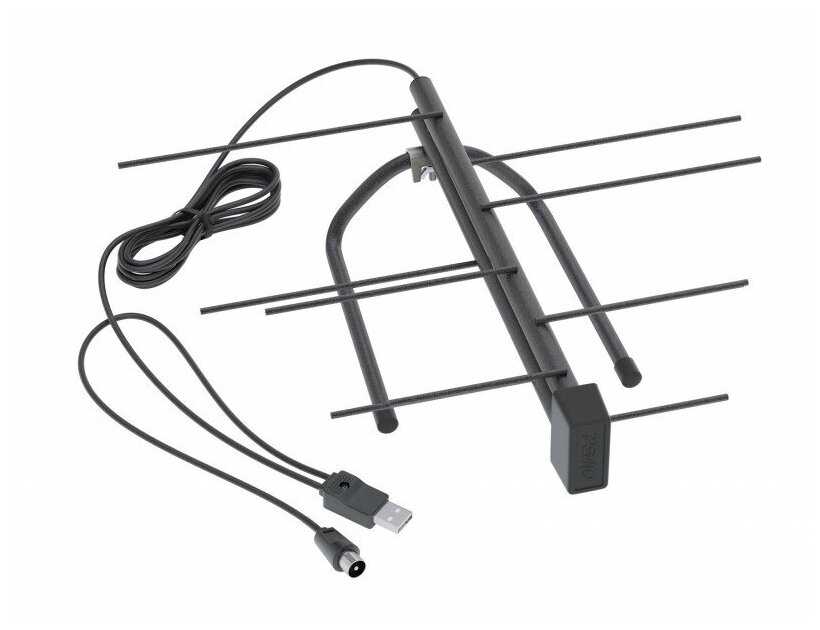 - + Мощная, компактная комнатная антенна с питанием о порта телевизора.
